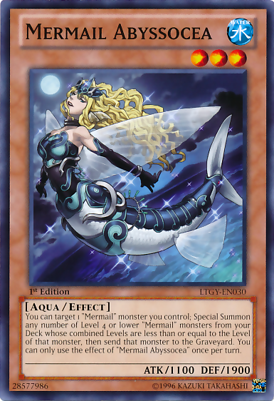 You can target 1 "Mermail" monster you control; Special Summon any number of Level 4 or lower "Mermail" monsters from your Deck whose combined Levels are less than or equal to the Level of that monster, then send that monster to the Graveyard. You can only use the effect of "Mermail Abyssocea" once per turn.